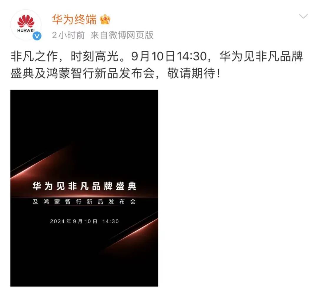 9月2日,“华为终端”微博发布消息称,华为将于9月10日14:30举办华为见非凡品牌盛典及鸿蒙智行新品发布会。